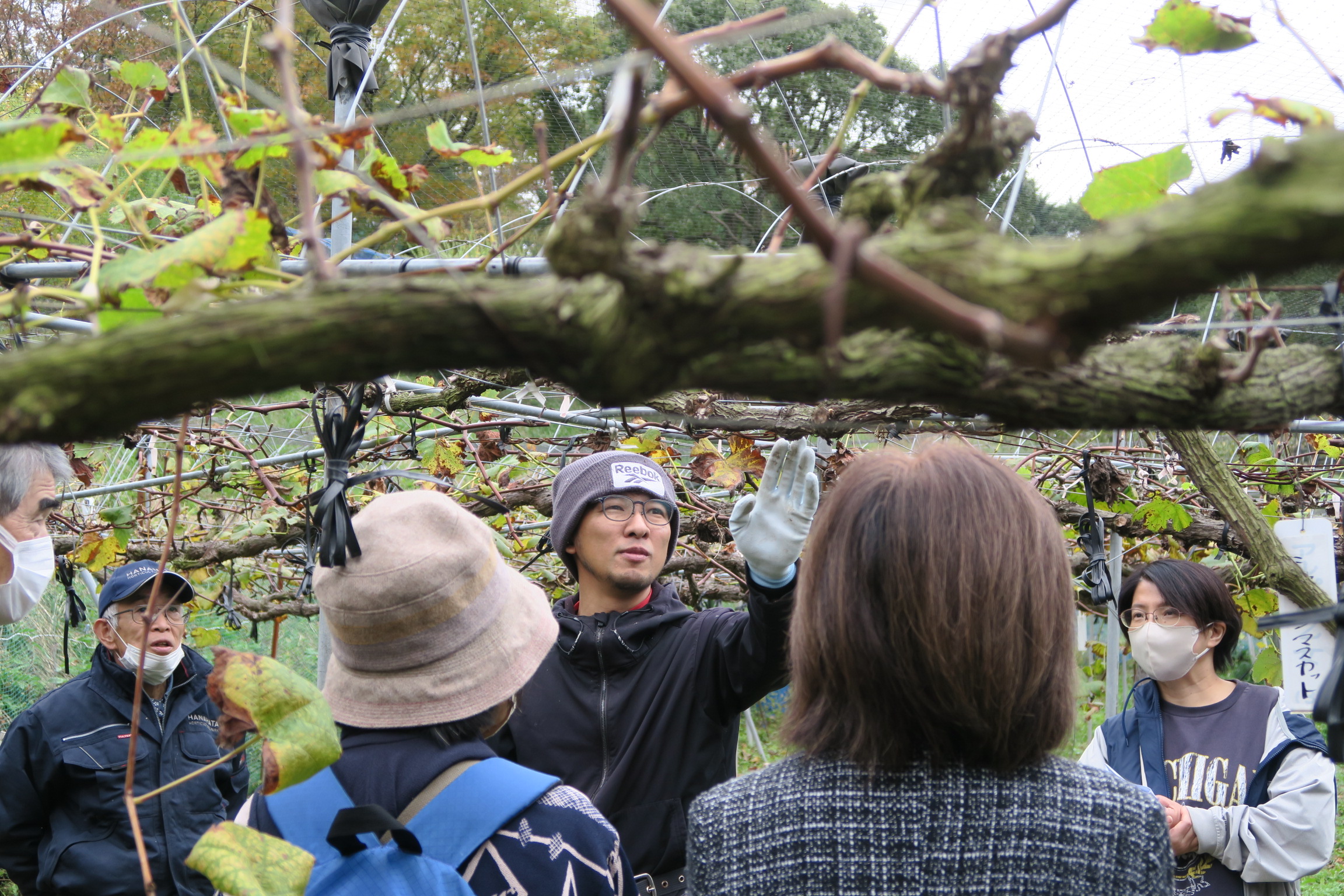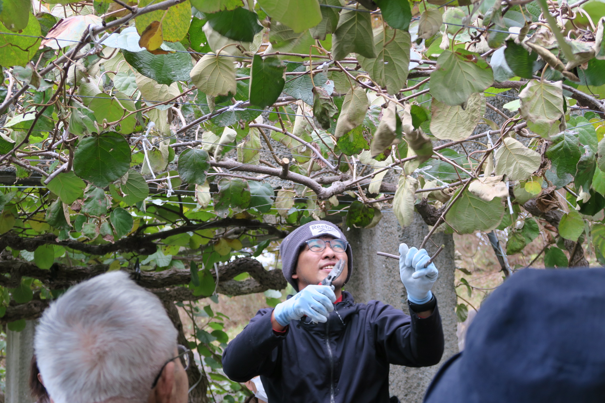基礎講座では、室内座学の後、各落葉果樹園に行き、講師によるせん定の様子を見て頂きました。