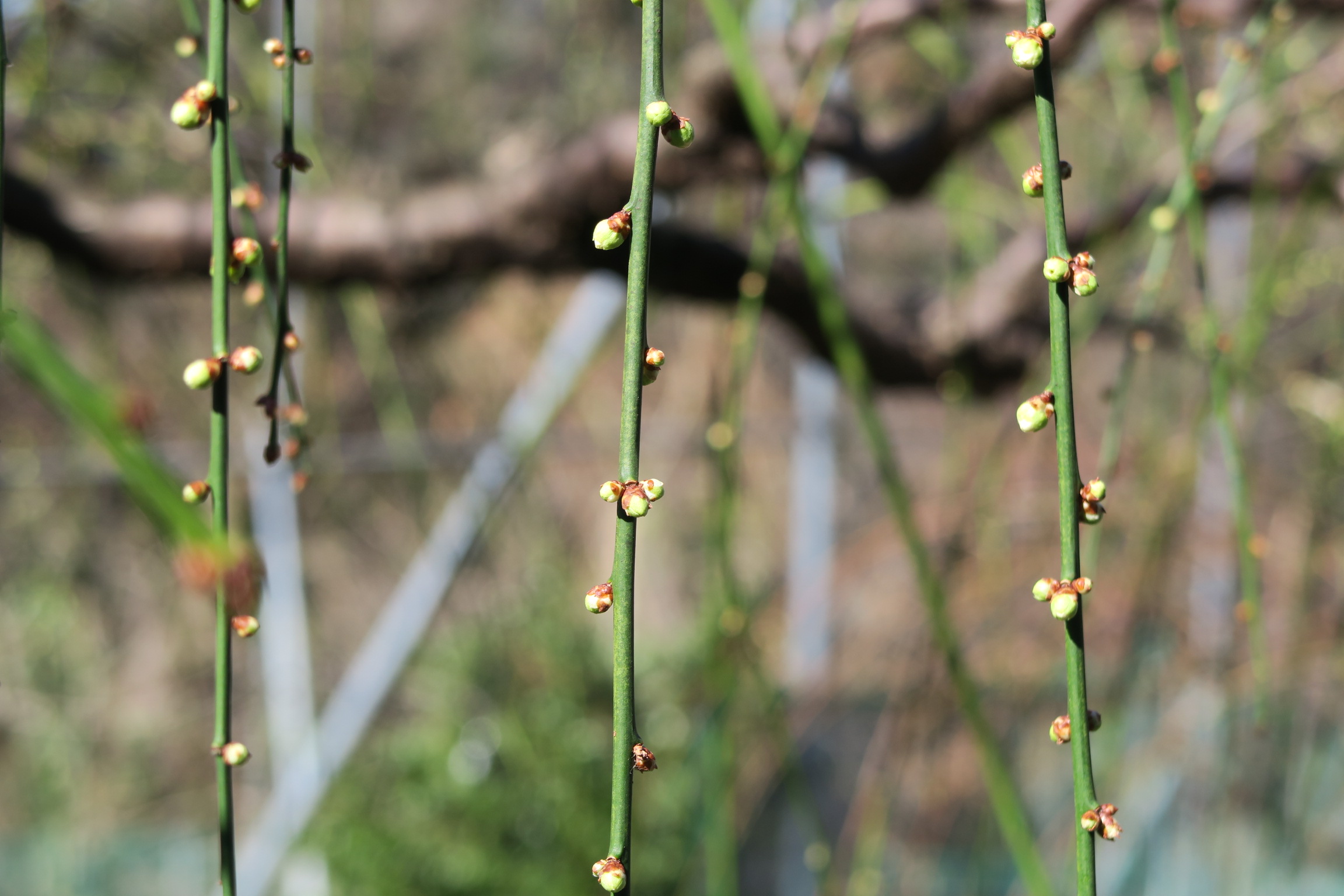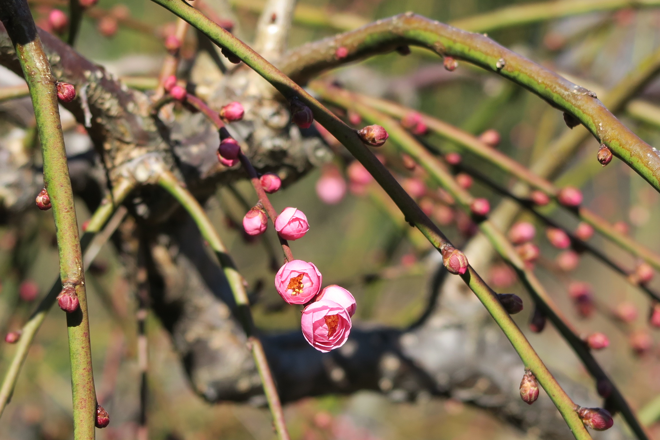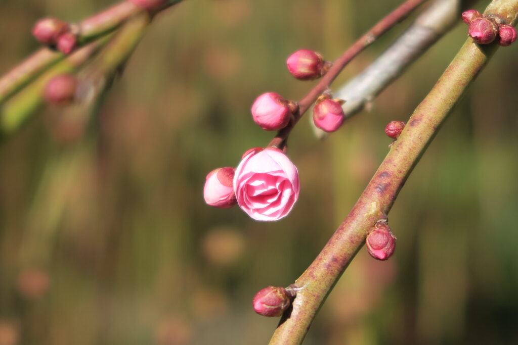 節分の日に噴水広場西側園路沿いのピンクのしだれ梅が咲き始めました。