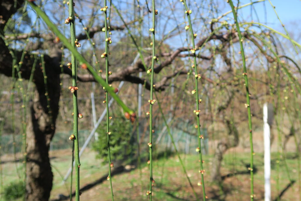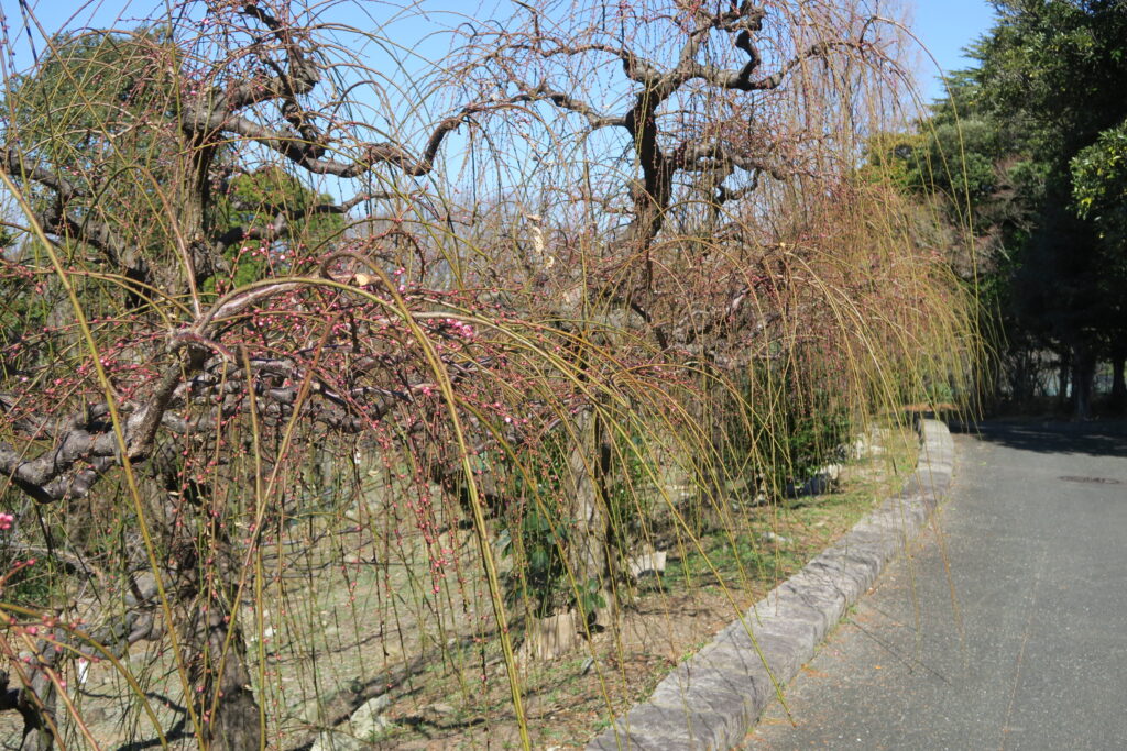白のしだれ梅のつぼみも大きく膨らみ始め、今年は2月の中旬過ぎには