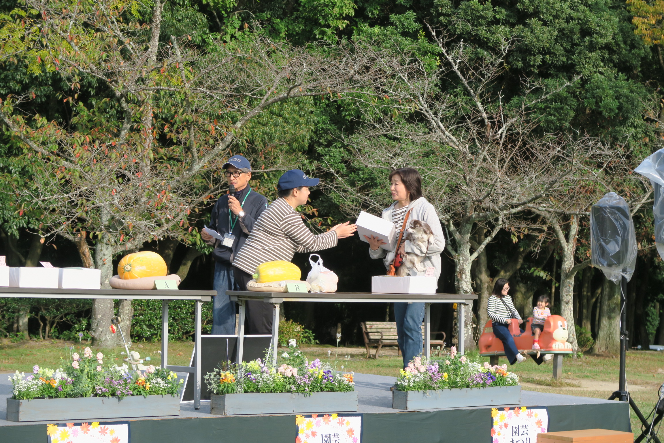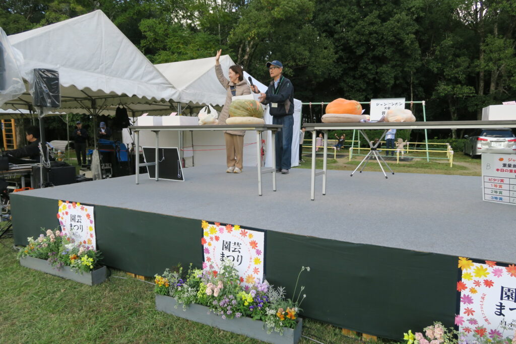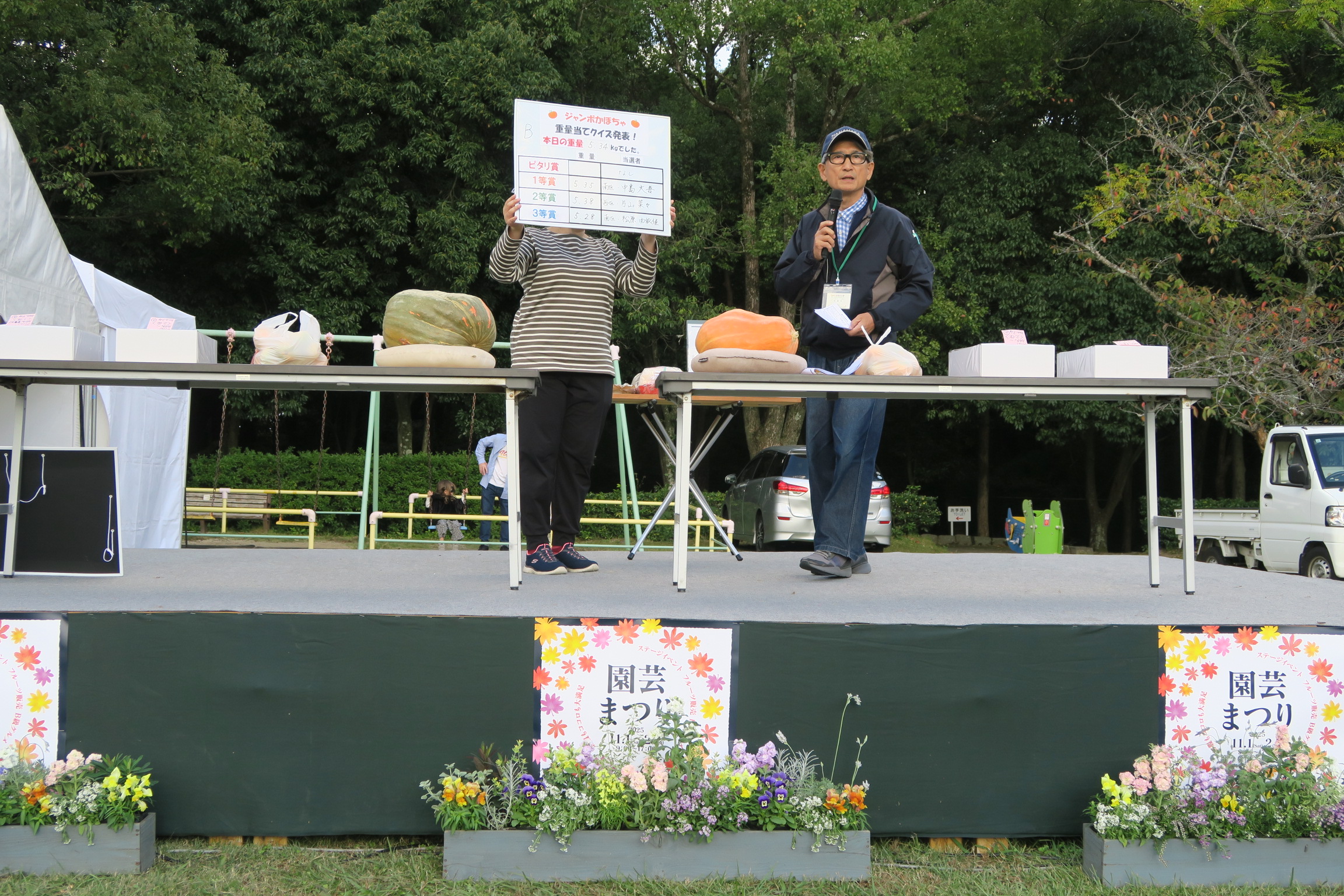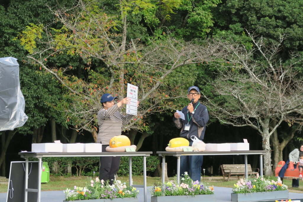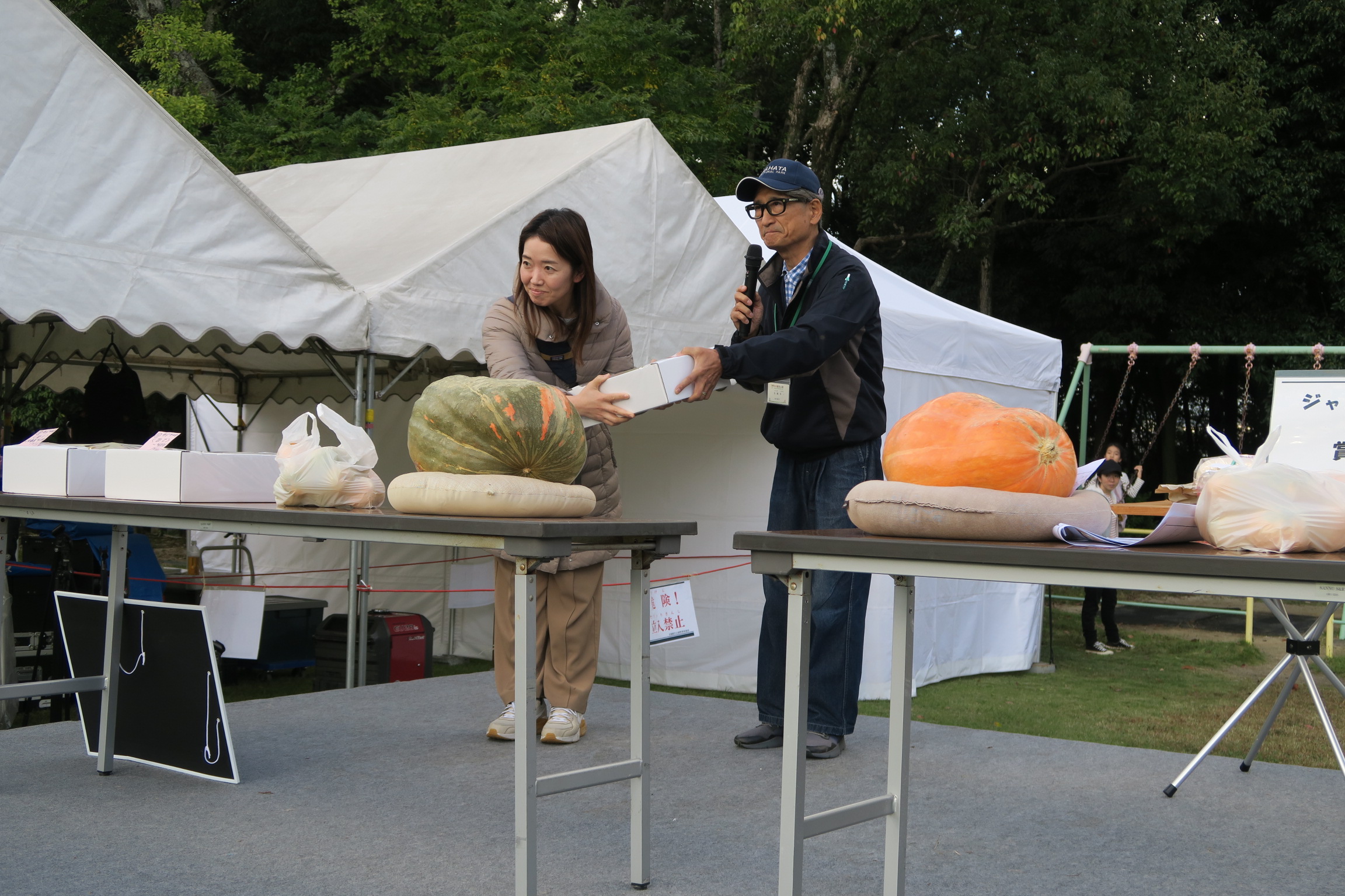 ジャンボカボチャ重量当てクイズの表彰式、賞品は園芸公園の美味しい