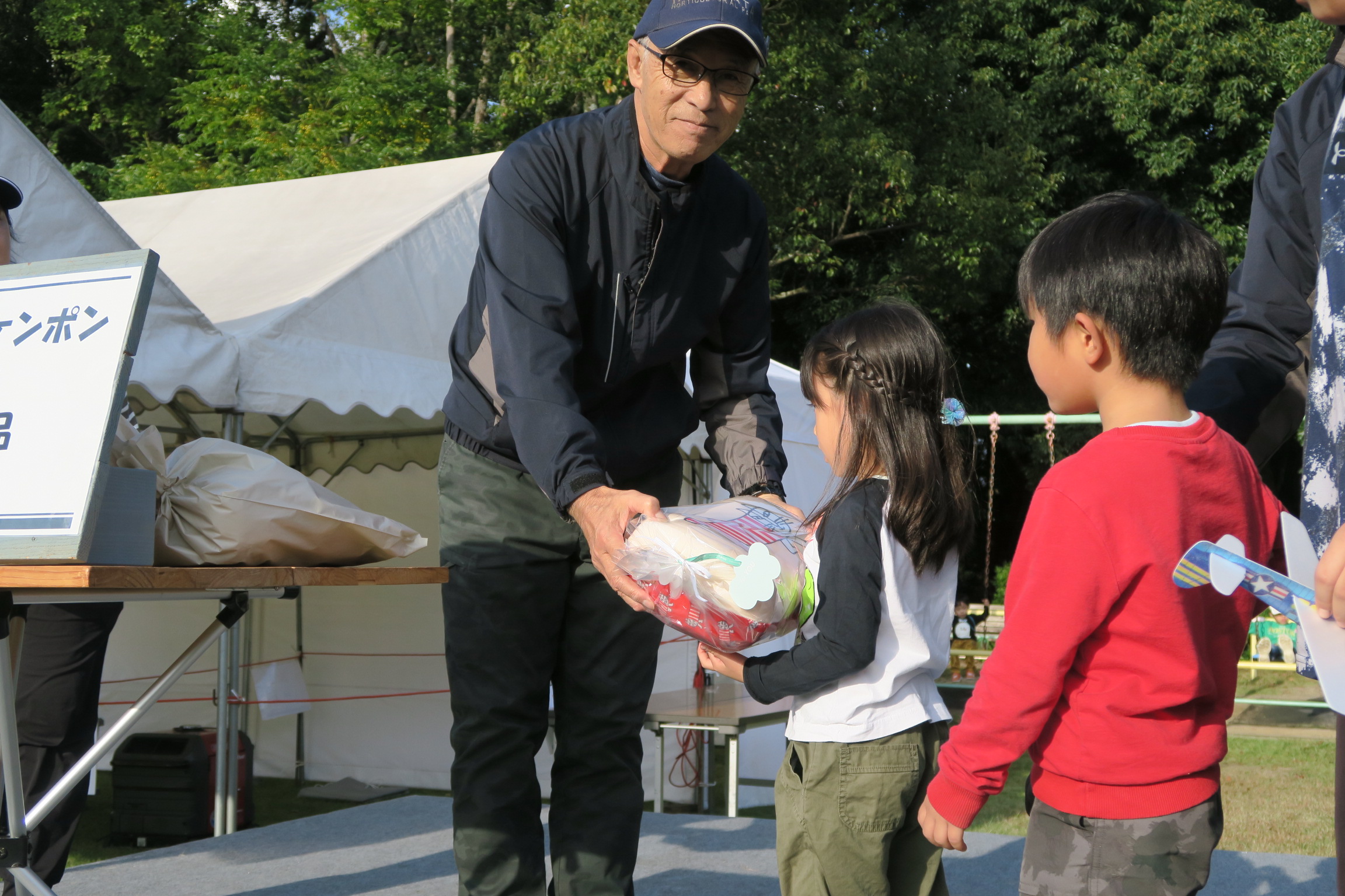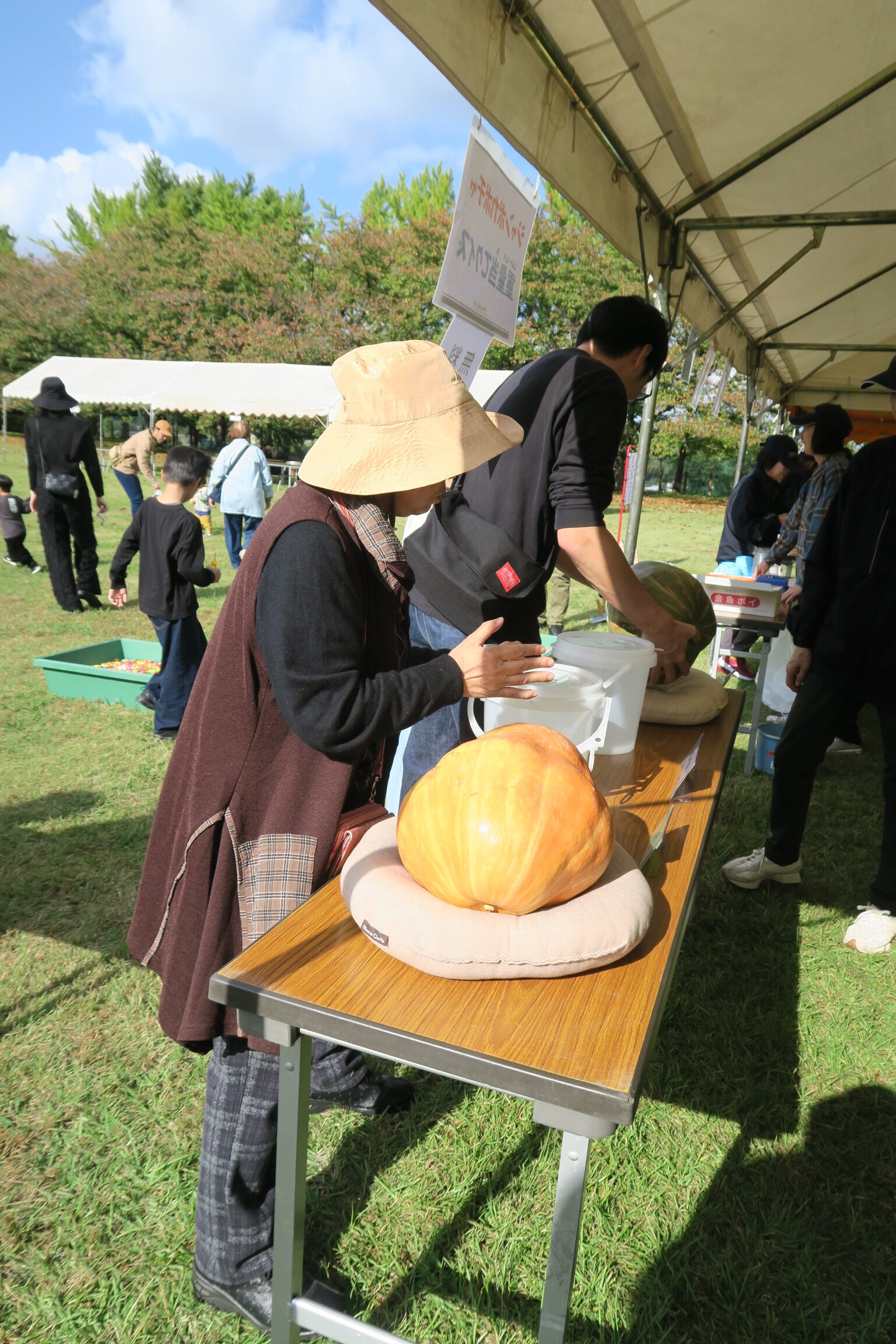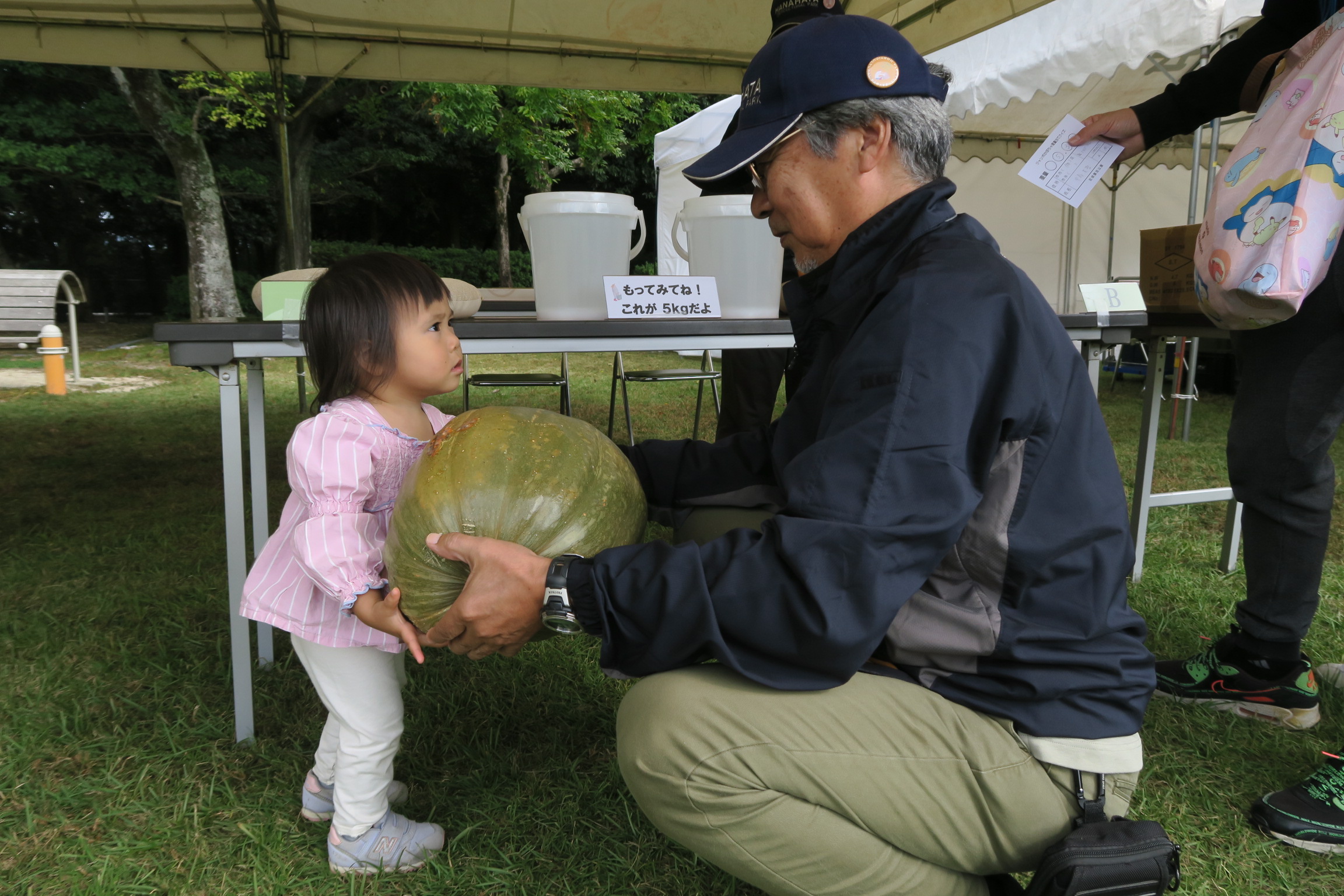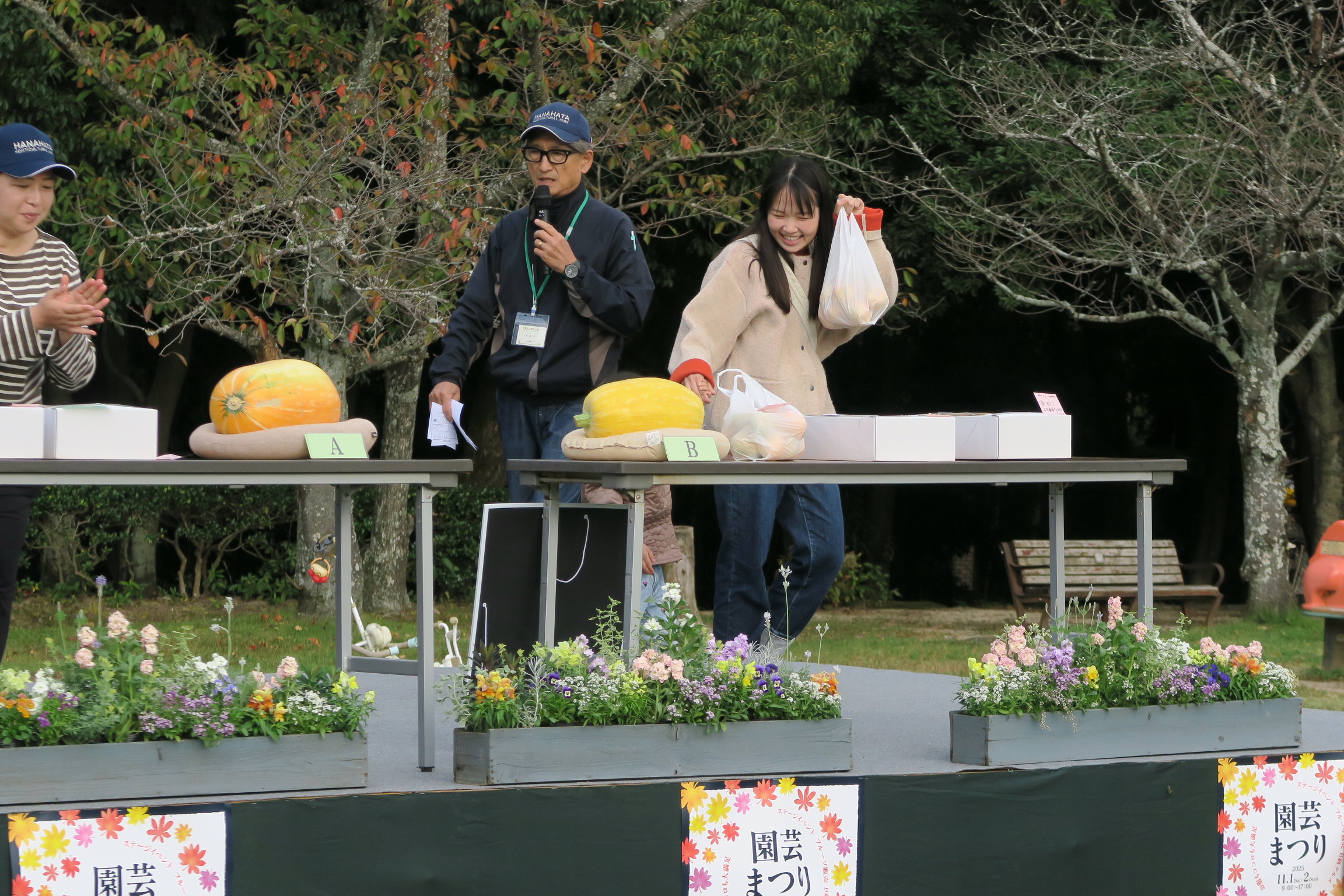 ジャンボカボチャ重量当てクイズの表彰式、賞品は園芸公園の美味しい