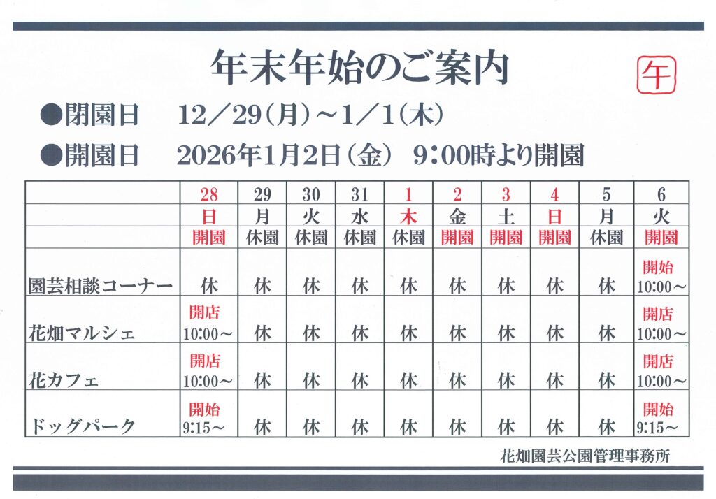 早いもので本日12/28(日)が花畑園芸公園 年内最後の開園日です。