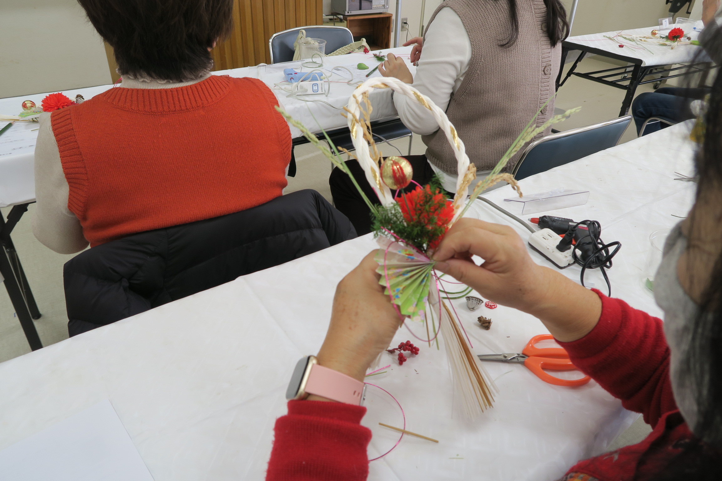 始めにしめ縄の形を作るところが難しく、皆さん先生の指導を仰いでおられましたが、飾り付けはセンス良くスムーズに進みました。