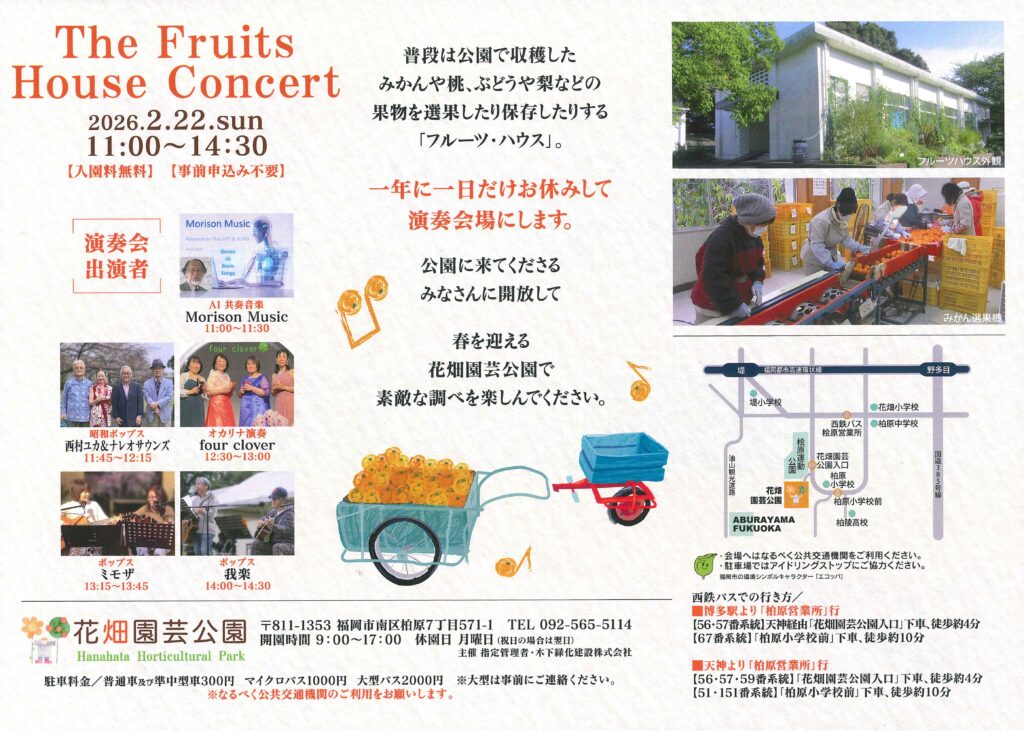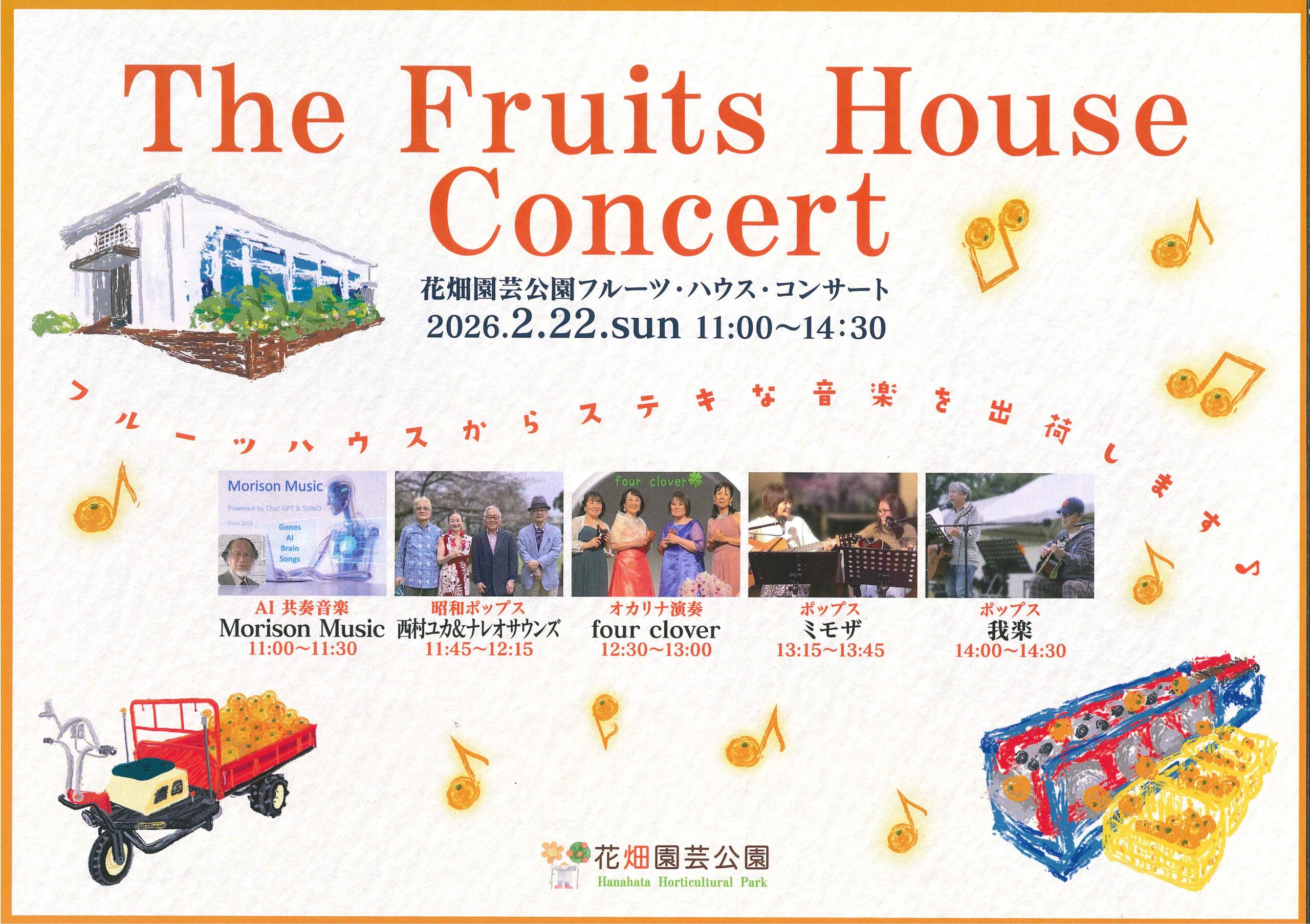 2.22(SUN)フルーツハウスコンサートのご案内 2026-01-09 2026.2.22.SUN 11:00~14:30 花畑園芸公園フルーツハウスコンサート 普段は公園で栽培し収穫したみかんや桃、ぶどうや梨などの 果物を選果したり保存したりする「フルーツハウス」 1日だけお休みにして演奏会場にします。 春を迎える花畑園芸公園で素敵な調べをお楽しみください。